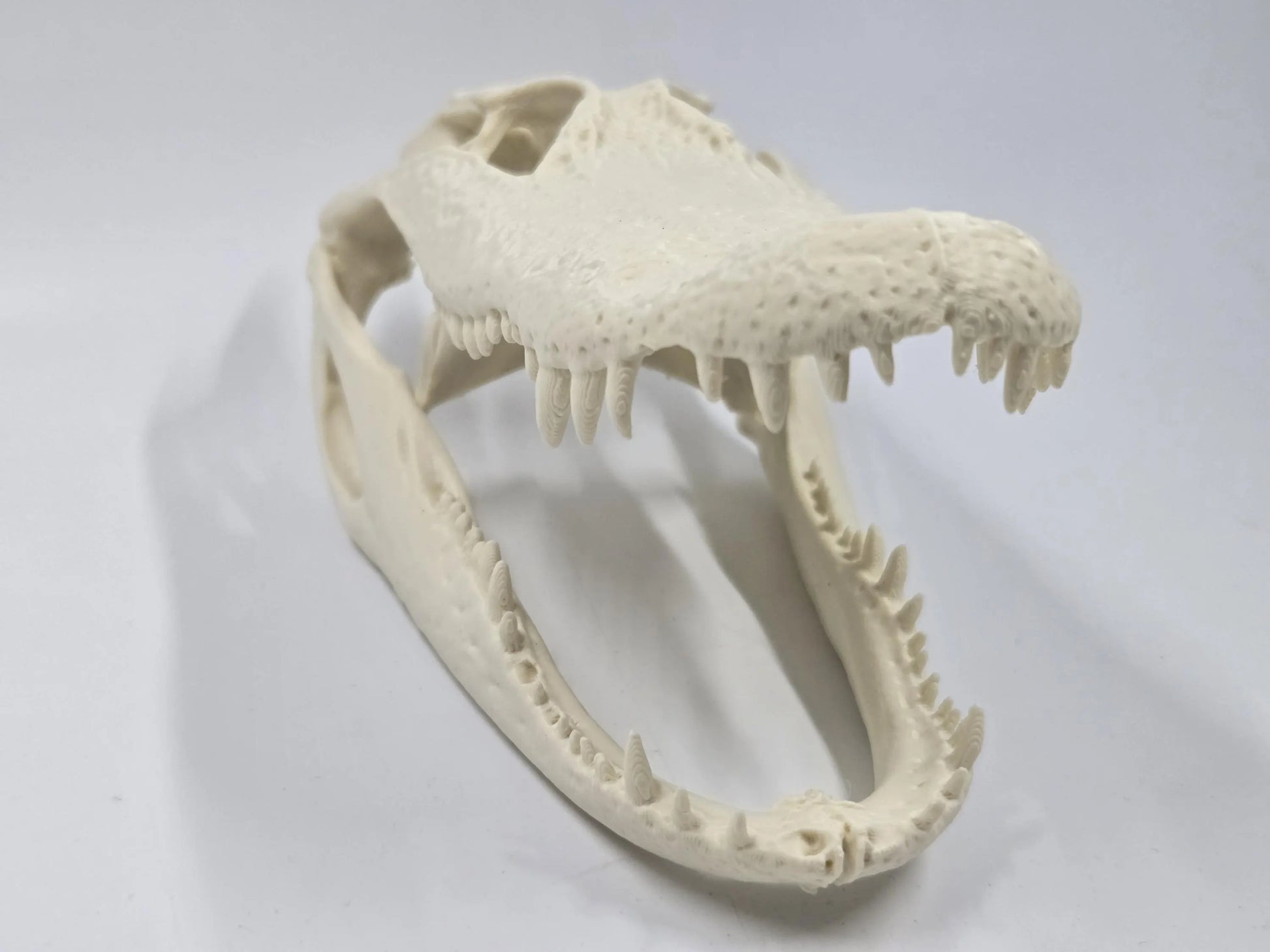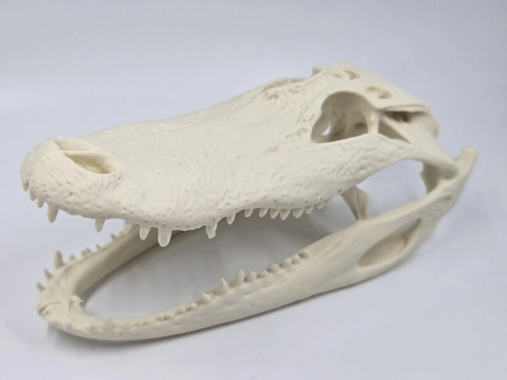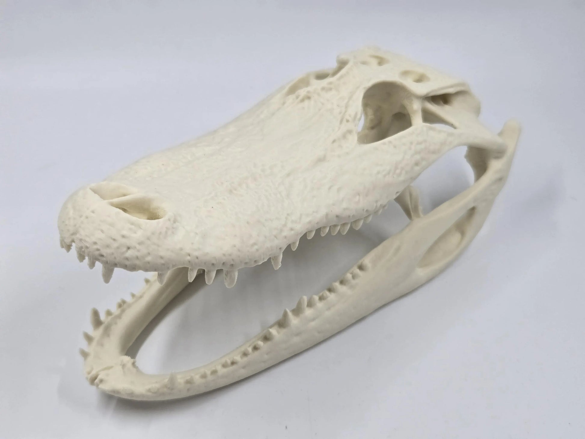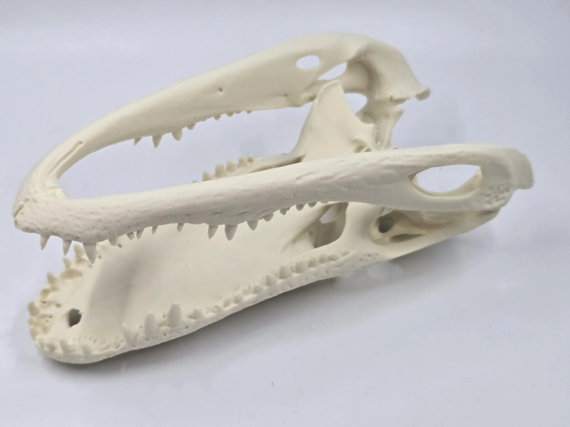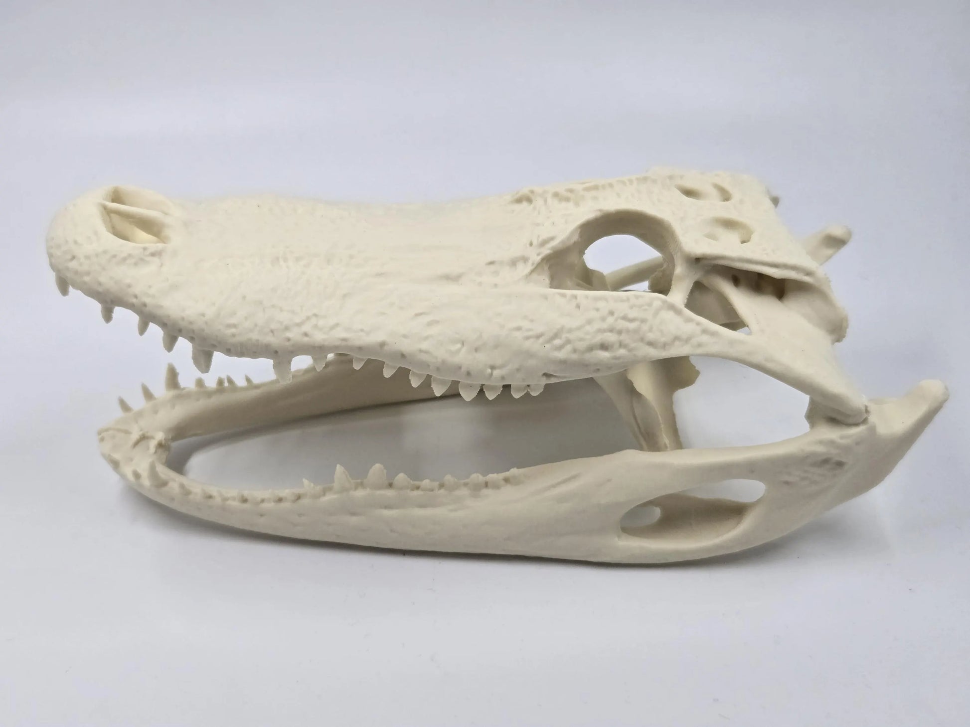 Exact replica of an American Alligator Skull (Alligator mississippiensis), created from digitalized scanning done by RISD Nature and licensed under Creative Commons Attribution-ShareAlike (http://creativecommons.org/licenses/by-sa/4.0/) using a real alligator skull. Skull measures 7 ½" and was made using scans from an alligator believed to be approximately 3 years old.