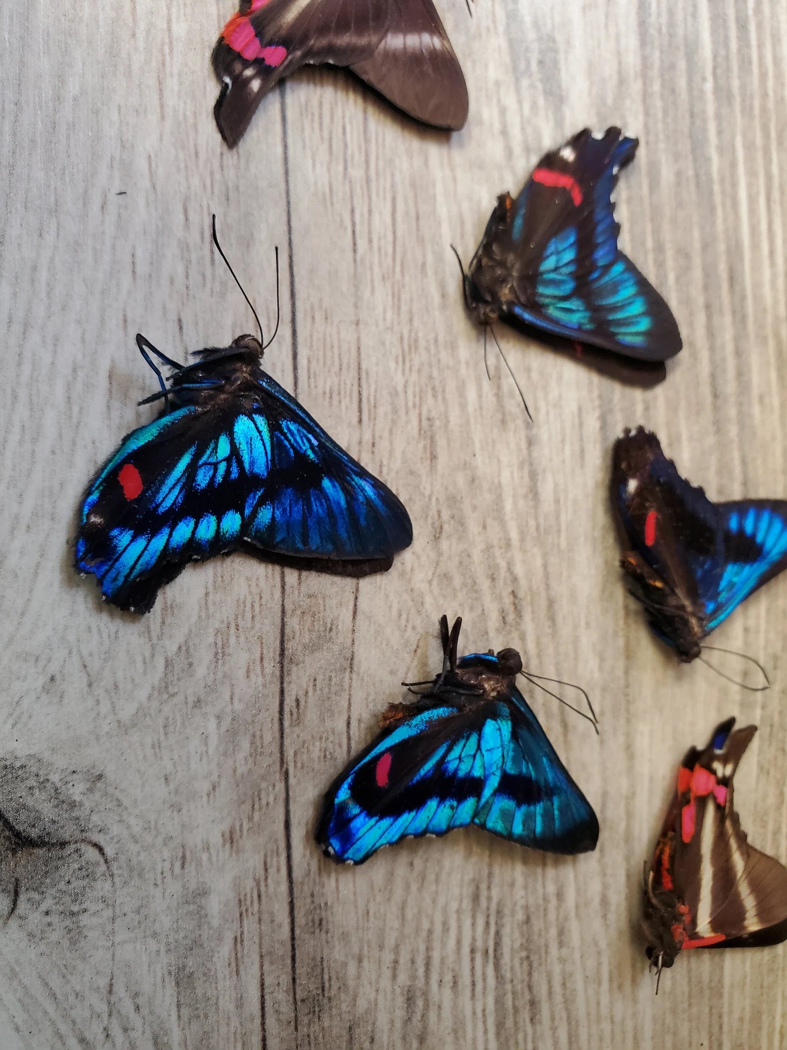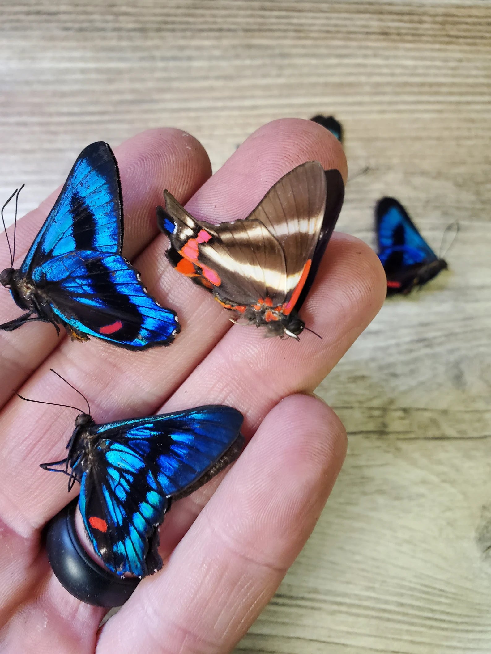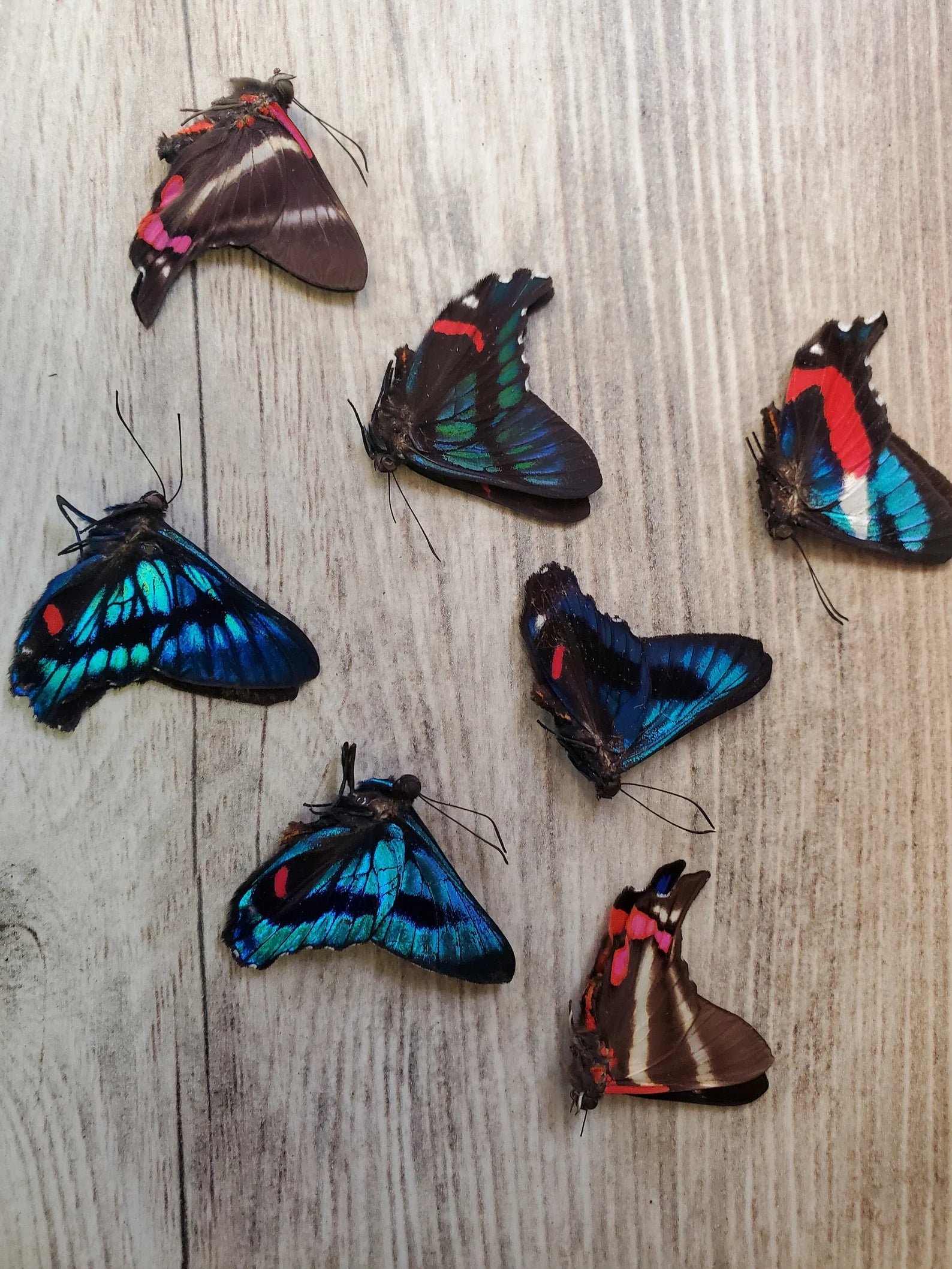 Some of the most colorful little butterflies around! This is mix of Rhetus species and Ancyluris species, which are widely collected for their electric blues and reds.