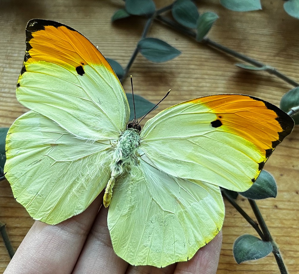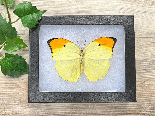 Anteos menippe, the angled orange tip butterfly will come with wings open and mounted in a 4 1/2" x 5 1/2" riker mount frame. Riker mounts allow you to enjoy your butterfly framed or take it out of the riker to use the butterfly for photographs (Just remember how fragile they are! It may cause legs, antennae, etc... to break off if you take the butterfly out).