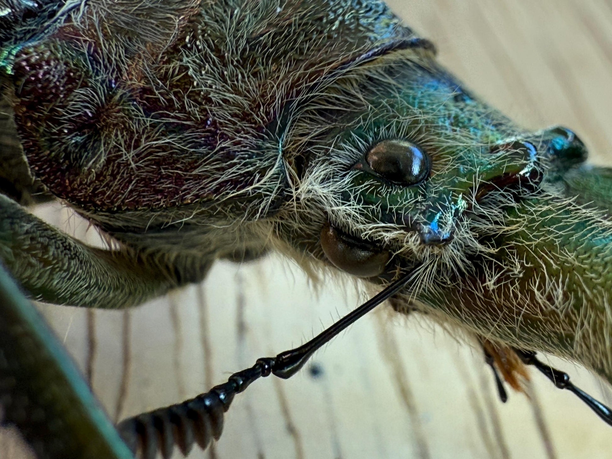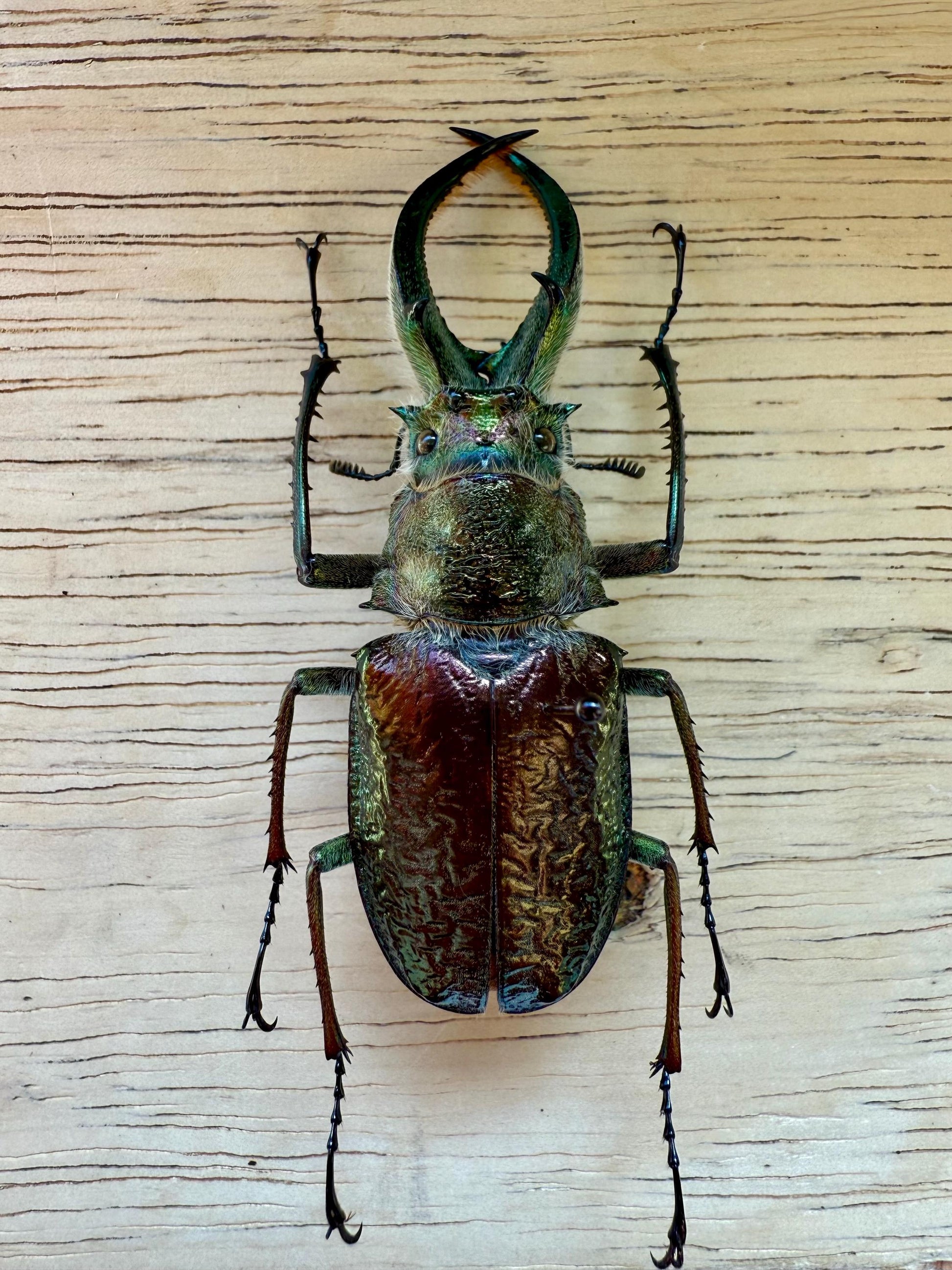 Found in Peru, these metallic stag beetles have a unique separating structure on the head, which gives the illusion of four eyes!
