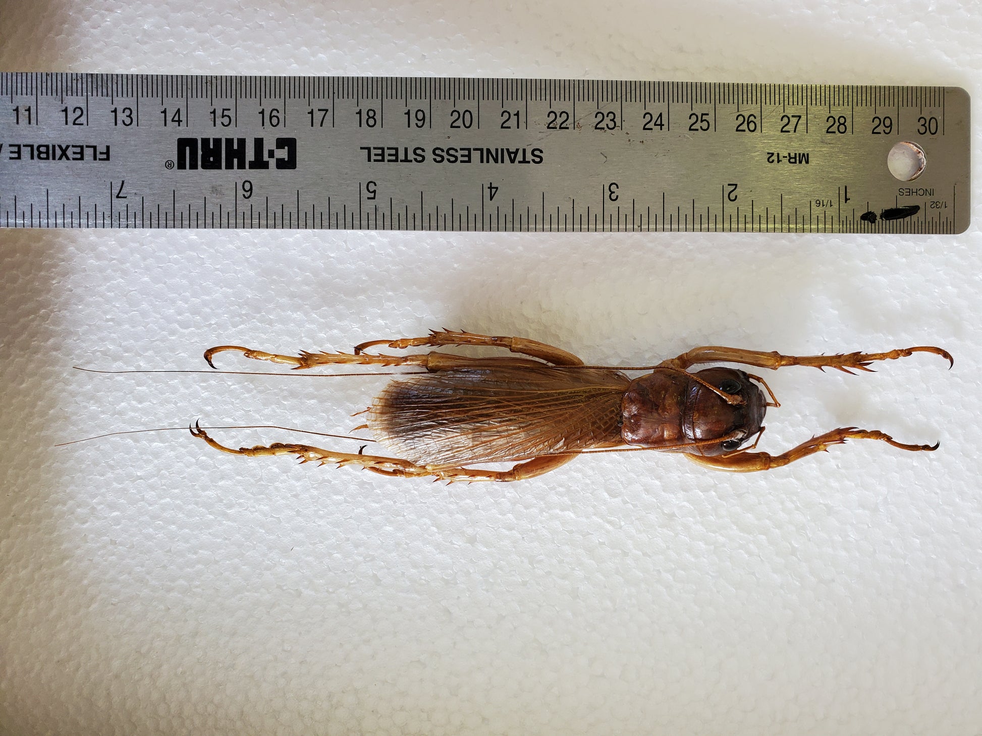 The Giant Obake Raspy Cricket is an ENORMOUS beast of a cricket! Their attitude matches their size as they have been known the fight and kill tarantulas. These are dead, dried specimens-please note their antennae are very long and very fragile so we cannot guarantee they will arrive undamaged.