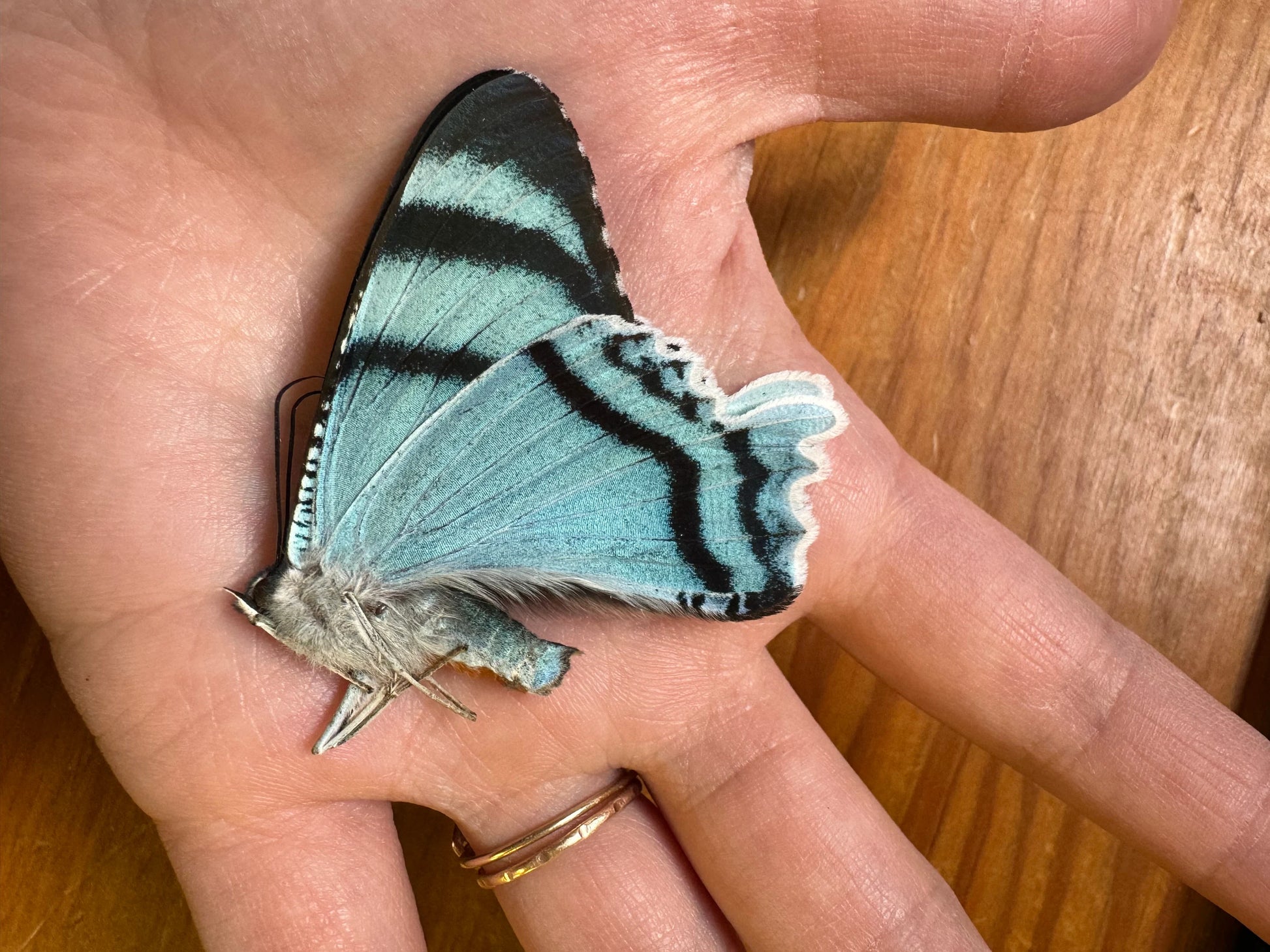 An incredible medium-large dayflying moth related to the famous Madagascar Sunset Moth, but much less commonly seen for sale. From Indonesia, they feature beautiful iridescent blue/green colors not often seen in nature. Very limited stock.