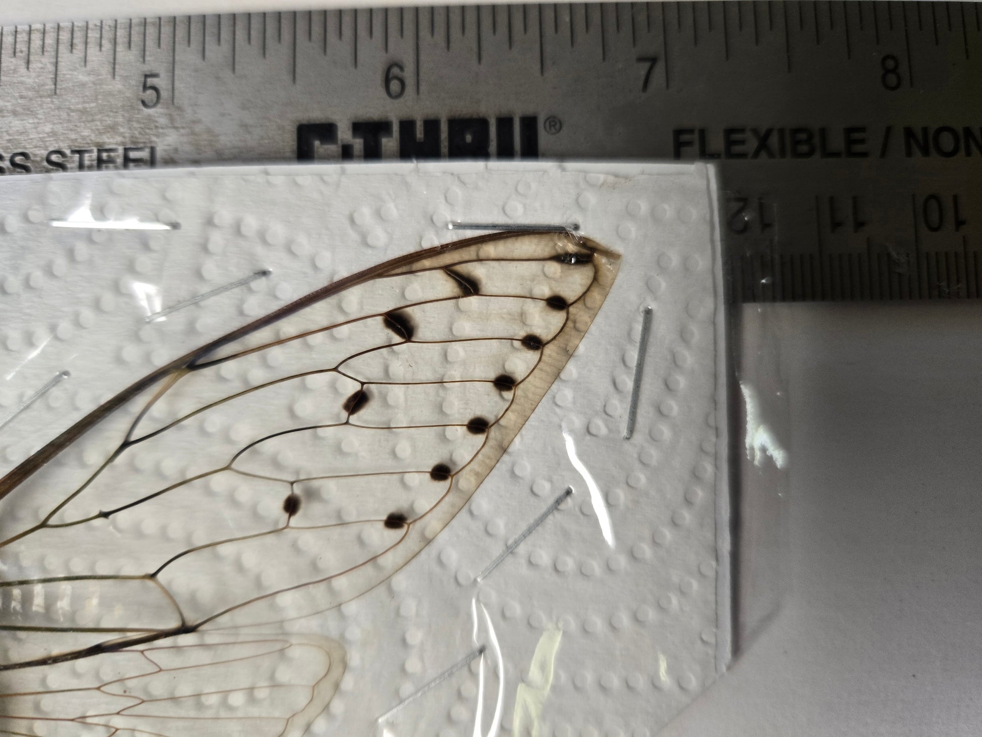 An awesomely huge cicada, but...poorly stapled through one wing:(