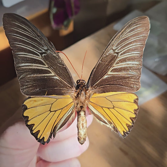 One of the most incredible birdwing species! This one is special for a lot of reasons! Troides magellanus one of the most iridescent butterflies known! At first it appears similar to any troides species, with just black and yellow being visible, but as you angle it the yellow turns a beautiful blueish-purple.