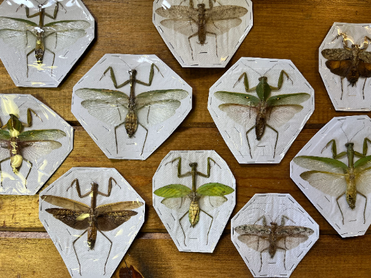 Mixed mantises! All with wings spread and nice and big! These are all from Malaysia, and have been gathered by the Orang Asli people in an effort to put the control of the insect trade back in the hands of the native tribes living in the regions where the insects are harvested. Purchasing these insects directly supports native people groups and gives them sustainable income options.