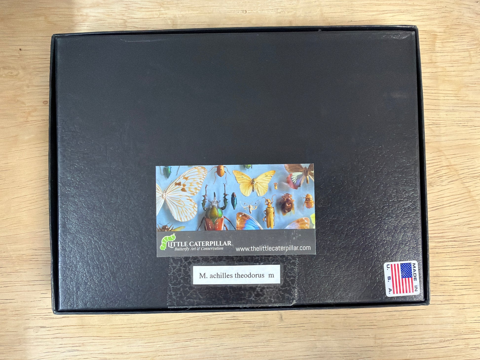 This morpho butterfly ships with wings open, spread and mounted in a 8 ¼ x 6 ¼ glass front riker mount frame. This framing style is typically used in museum collections, and allows for the specimen to be easily displayed or even removed for placement in a different frame/shadowbox.