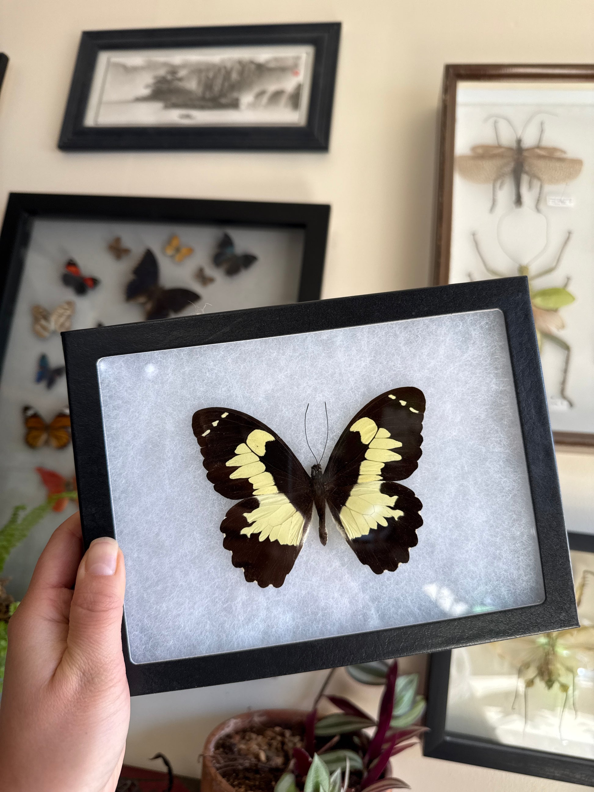 This swallowtail butterfly ships with wings open, professionally spread and mounted in a 8 ¼ x 6 ¼ glass front riker mount frame. This framing style is typically used in museum collections, and allows for the specimen to be easily displayed or even removed for placement in a different frame/shadowbox.