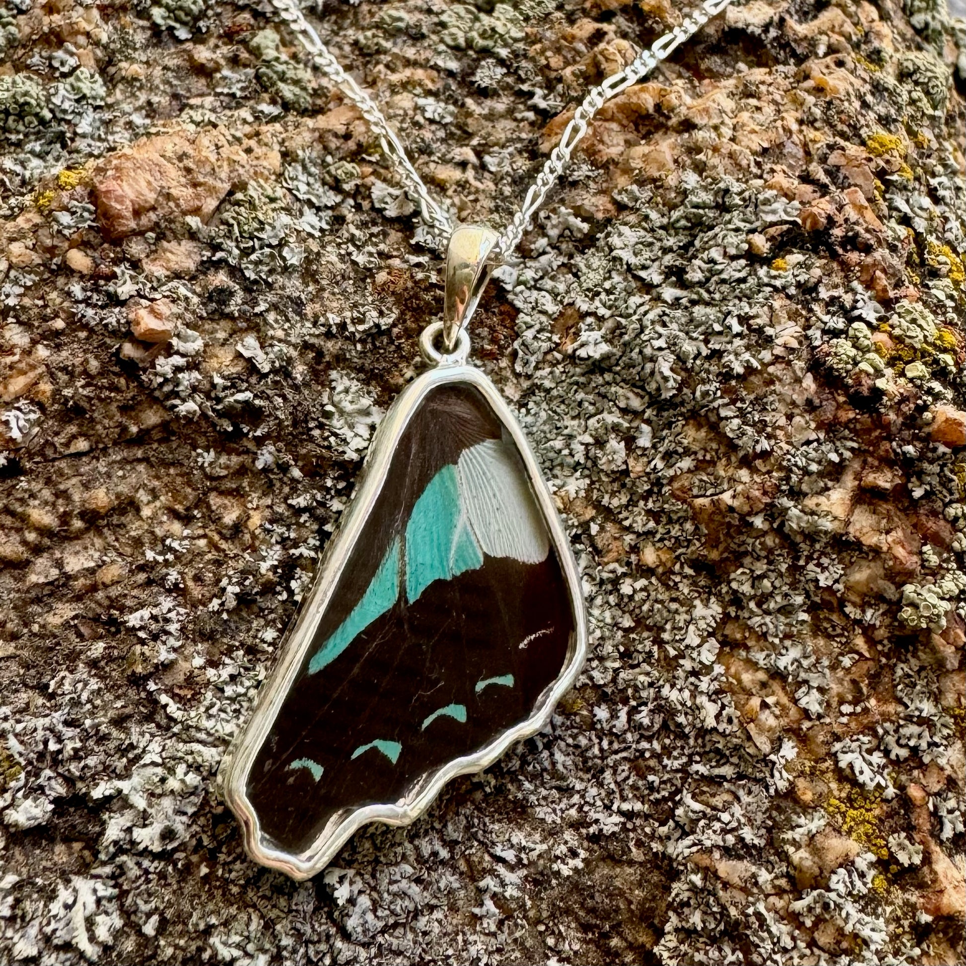 REAL Bluebottle Butterfly Wing Pendant in 99.5 Fine Silver with 18"-20" Sterling Silver Chain