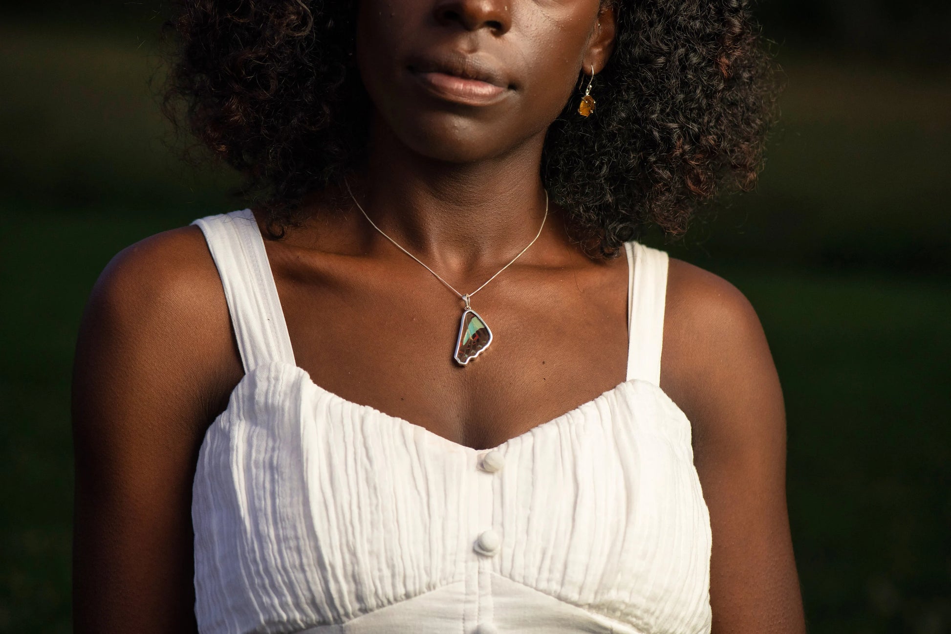 Every butterfly is unique and each pendant may have slight variations. The design also allows both sides of the butterfly wing to be seen.