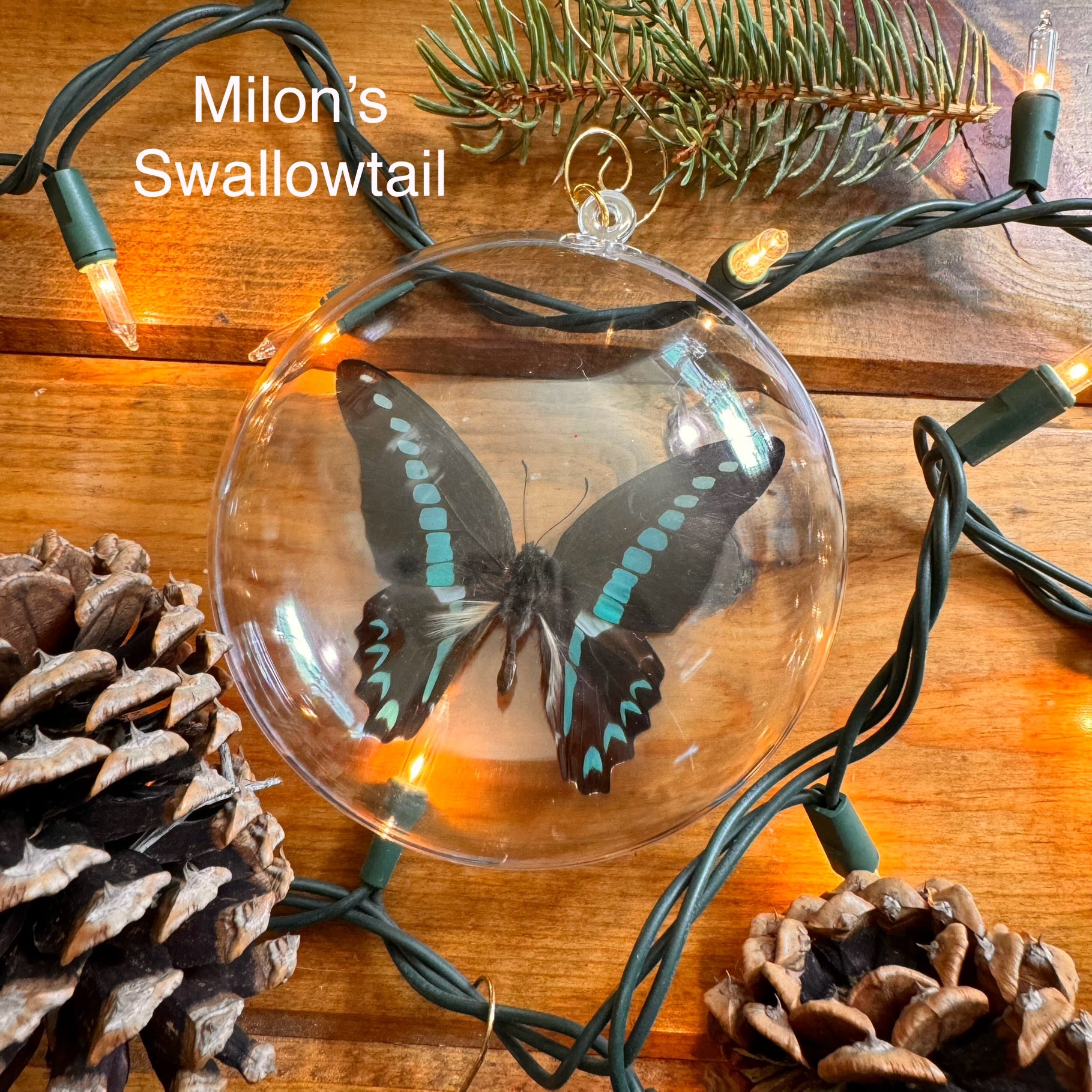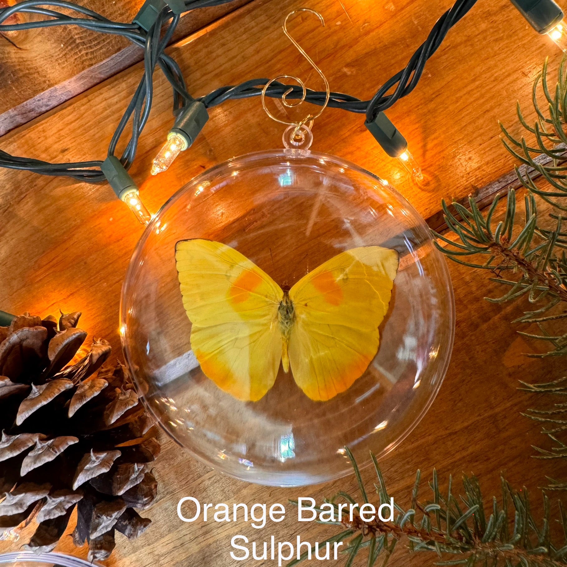 These ornaments are made from a clear plastic sphere, measuring 4¼" X 2", with a REAL butterfly specimen inside! A portion of all sales is donated back to support conservation. Each ornament comes with gold hanging hardware.