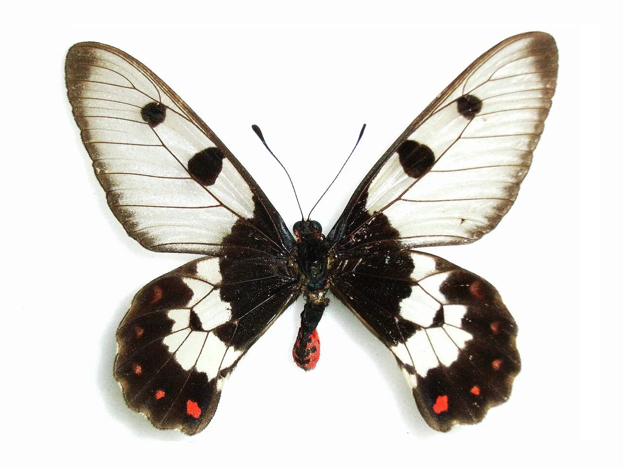 Really unusual in both shape and color (and name), Cressida cressida is a swallowtail with beautiful white, blacks and reds on its hindwings, and almost transparent forewings.