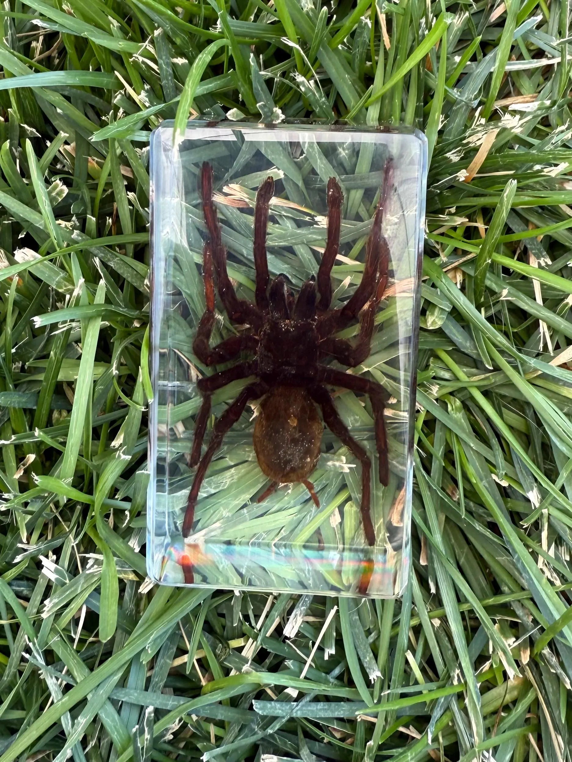 This resin block features one real, preserved Ornithoctonus huwena tarantula.