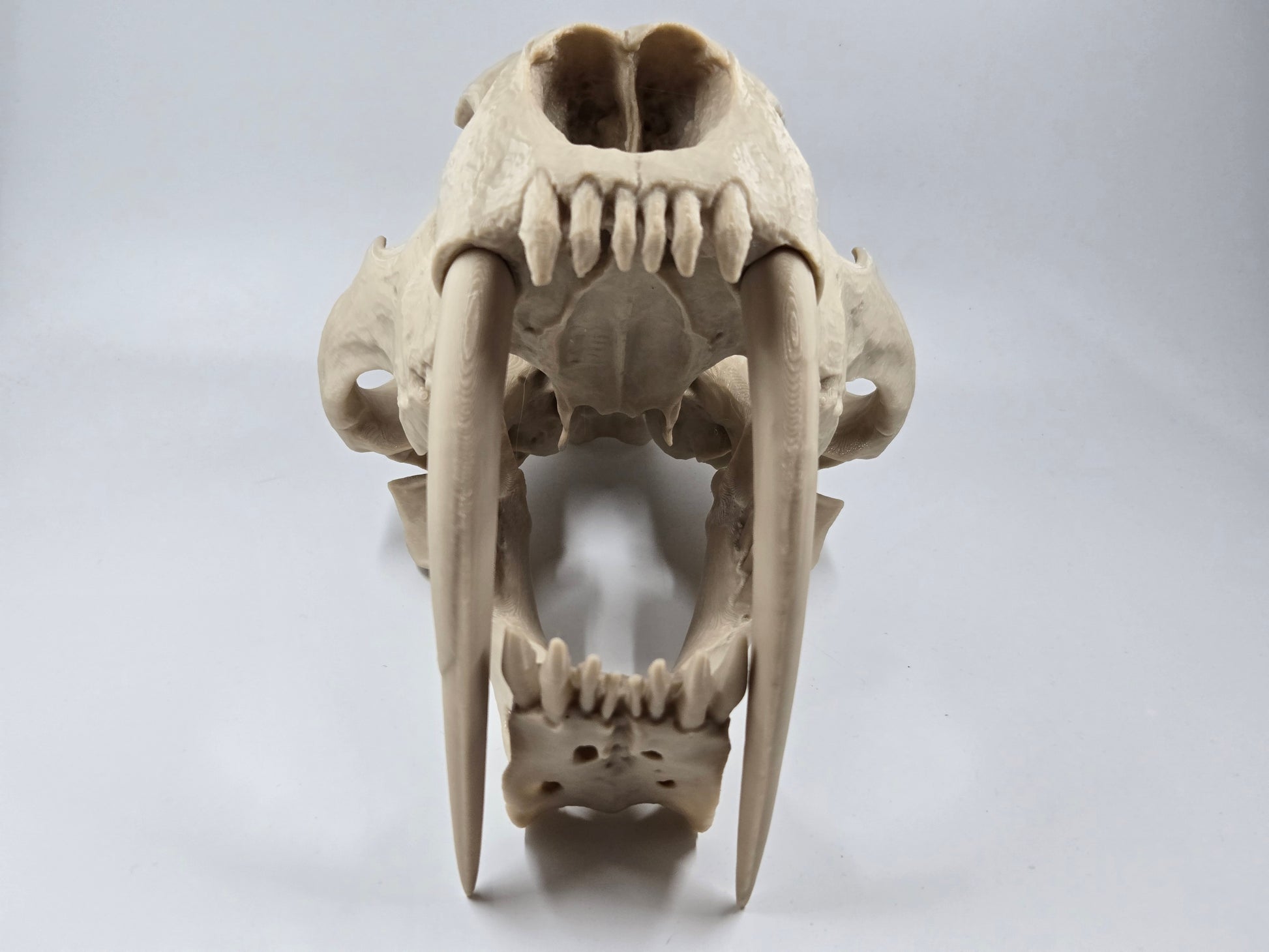 Full size 1:1 replica of a Saber tooth Tiger, smilodon fatalis, created from digitalized scanning done by Idaho Virtualization Laboratory and licensed under Creative Commons Attribution-ShareAlike (http://creativecommons.org/licenses/by-sa/4.0/) using one of the best known preserved skulls from the Natural History Museum of Los Angeles County.